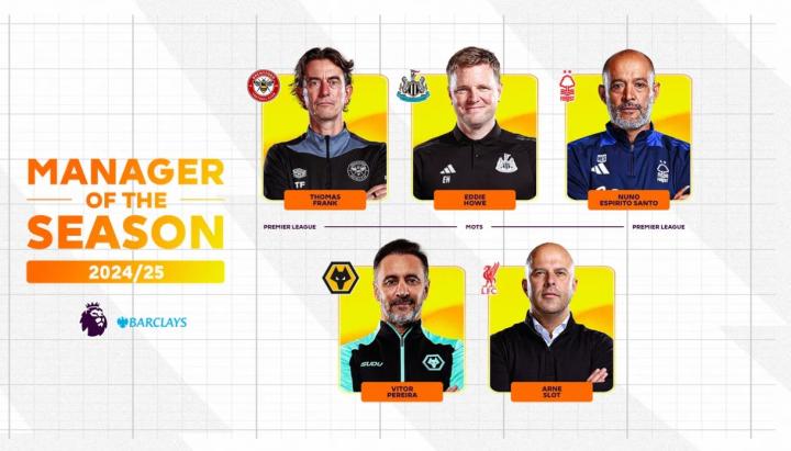 英超官方公布2024-25赛季最佳主帅候选名单